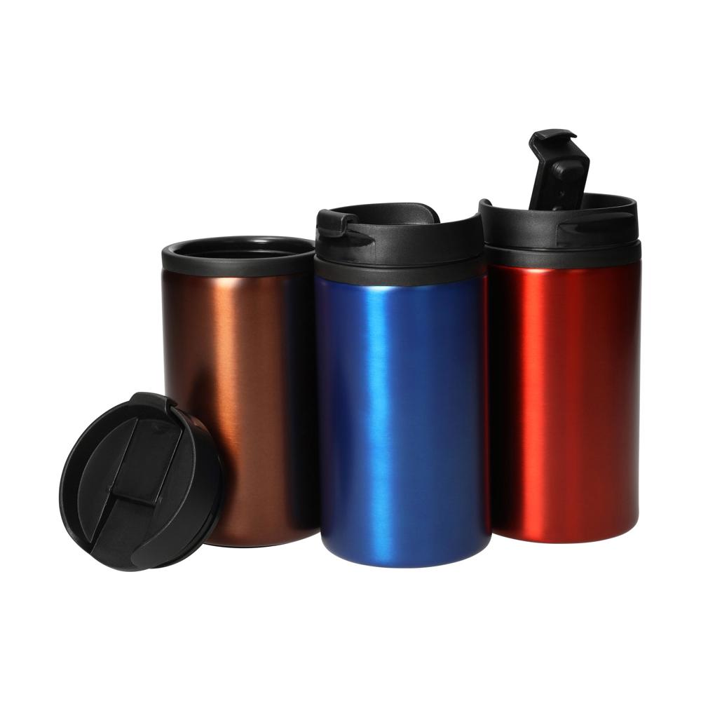 Doppelwandiger Edelstahlbecher mit abnehmbarem Deckel. Boden antirutschbeschichtet. Füllmenge: 0,25 Liter.