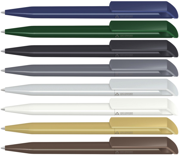 Dreieckiger Textmarker mit drei Schreibfarben. Große Druckfläche auf beiden Seiten. Ideal für den vollfarbigen Digitaldruck.