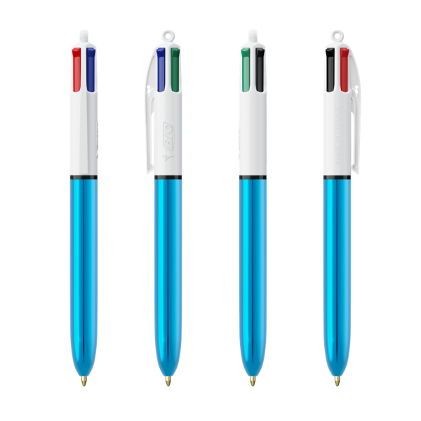Der BIC® 4 Colours® in glänzenden Metallic-Farben. Enthält vier Standard-Farbtinten: Blau, Schwarz, Rot und Grün. Unser legendärer BIC® 4 Colours® wird nachhaltiger, jetzt mit 13 % weniger Kunststoff im oberen Bereich!