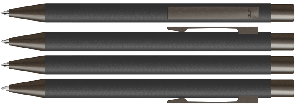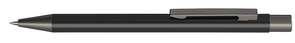 Metall-Druckbleistift (0,7mm) mit glänzendem Gehäuse. Metallclip, Metallspitze und Drücker GUN metallic. Radiergummi im Drücker.