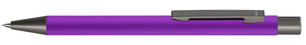 Metall-Druckbleistift (0,7mm) mit Softtouch-Gehäuse. Metallclip, Metallspitze und Drücker GUN metallic. Radiergummi im Drücker.