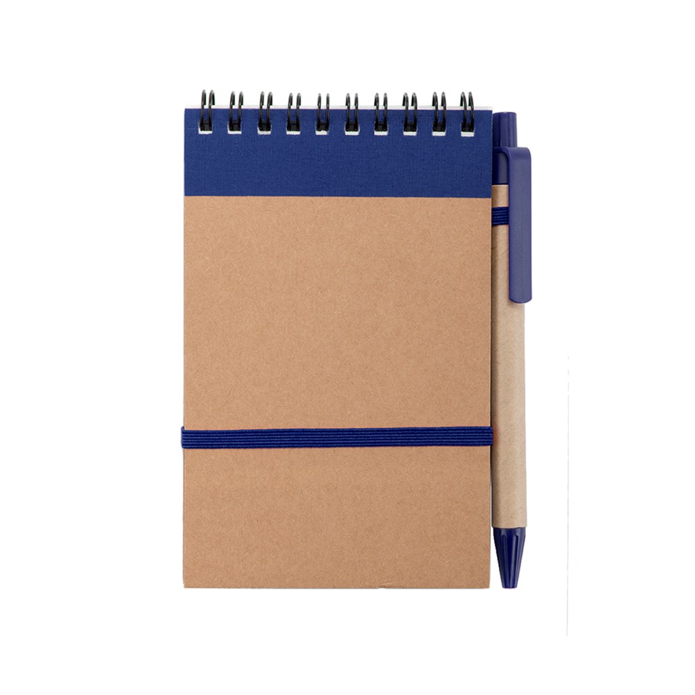 Ringbuch aus stabilem zweifarbigem Recyclingkarton mit weichem Einband, Gummizug und passendem Stift aus Recyclingkarton. In kräftigen Farben.