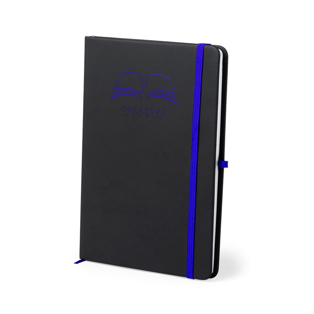 Notizbuch mit Soft-Touch-Cover aus Kunstleder in elegantem Schwarz. Mit Gummibandverschluss, Lesezeichenband und elastischem Stifthalter in lebendigen Farben. Mit einer speziell für den Laserdruck entwickelten Außenbeschichtung, durch die Ihre Werbung oder Ihr Logo perfekt graviert wird - passend zur Farbe der Kontrastdetails. Enthält 100 linierte Blätter.