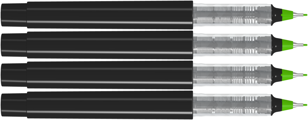 Fineliner mit Gehäuse aus recyceltem PET-Material in gedeckt glänzend weiß oder schwarz. Stopfen in den 12 möglichen Schreibfarben.