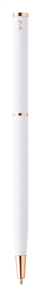 Drehkugelschreiber aus recyceltem Aluminium mit gummierter Oberfläche und rosagoldenen Elementen. Mit Spezialbeschichtung für rosagoldenfarbene Spiegelgravuren. Blauschreibend.