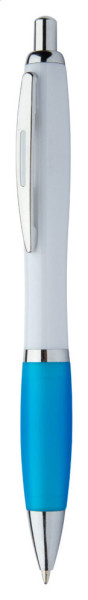 Kunststoff-Kugelschreiber mit weißem Schaft, farbiger Griffzone und verchromten Elementen, blauschreibend.