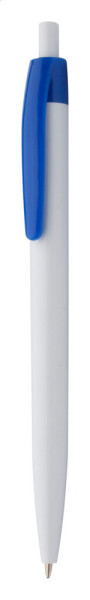 Weißer Kunststoff-Kugelschreiber mit farbigem Clip, blauschreibend.