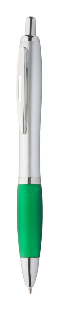 Kunststoff-Kugelschreiber mit silbernem Schaft und farbiger Gummi-Griffzone, blauschreibend.