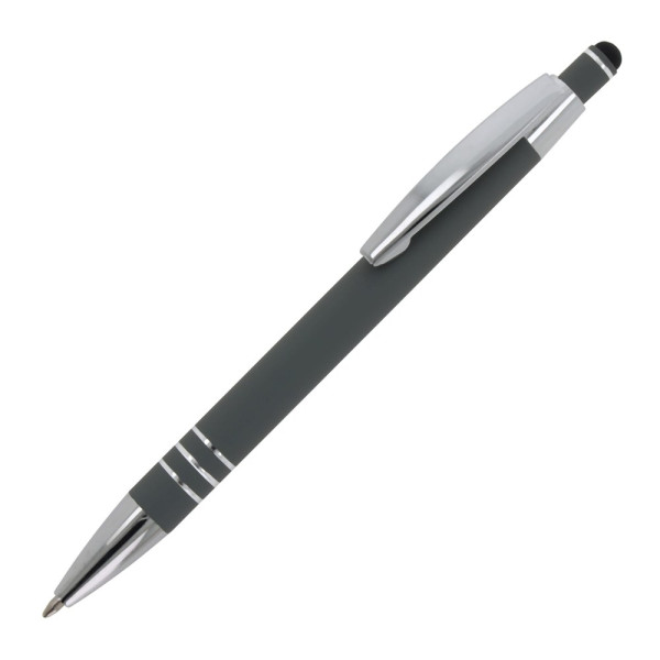 Kugelschreiber aus Aluminium mit elegantem Soft-Touch-Finish und Stylus. Mit massivem Metallclip. Schreibfarbe: blau.