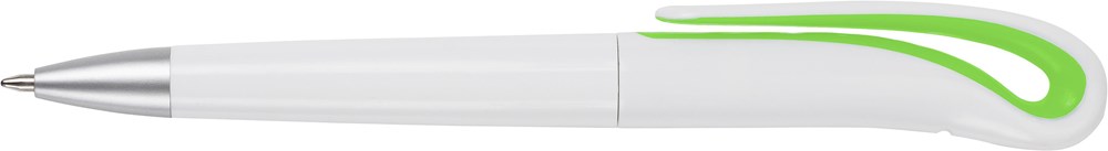 Drehkugelschreiber aus Kunststoff, weiß mit farbigen Akzenten und schwarzer Mine. mehr