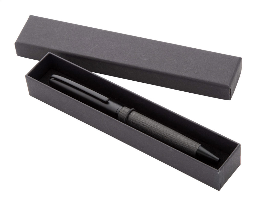 Eleganter Drehkugelschreiber aus Metall mit Schaft aus PU-Leder und schwarzen Teilen. In schwarzer Geschenkbox. Mit blauschreibender Mine.