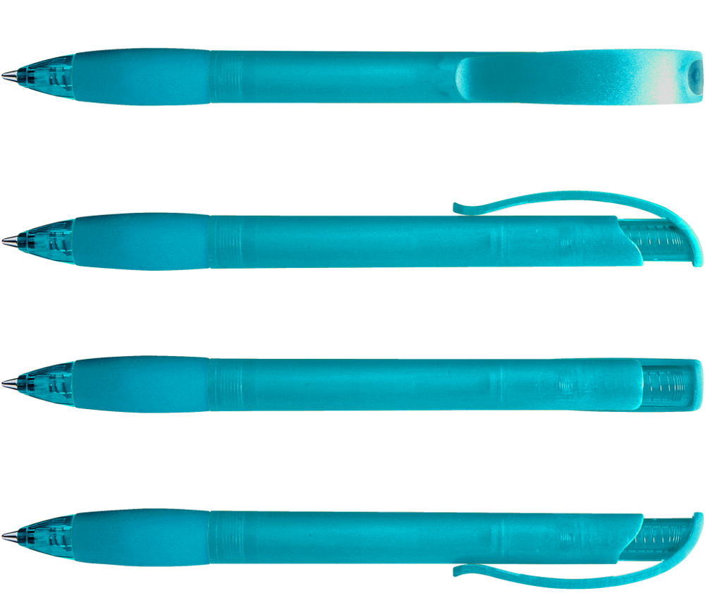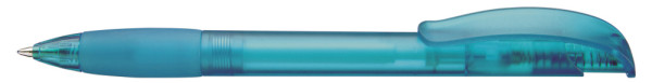Druckkugelschreiber mit transparent gefrostetem Gehäuse, Gummigriffzone und Clipdrücker mit Stopfen.
