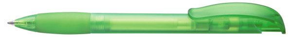 Druckkugelschreiber mit transparent gefrostetem Gehäuse, Gummigriffzone und Clipdrücker mit Stopfen.