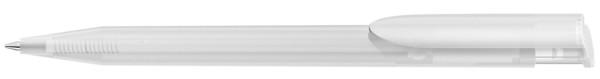 Druckkugelschreiber mit transparent gefrostetem Gehäuse und Clipdrücker.