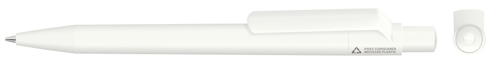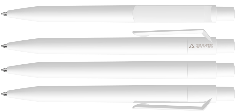 Druckkugelschreiber mit gedeckt mattem Gehäuse, Clip, Drücker und Stopfen aus 100% recyceltem Post-Consumer-Kunststoff.