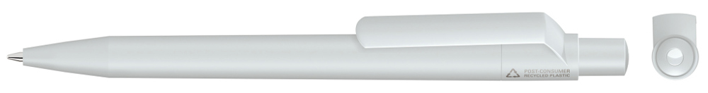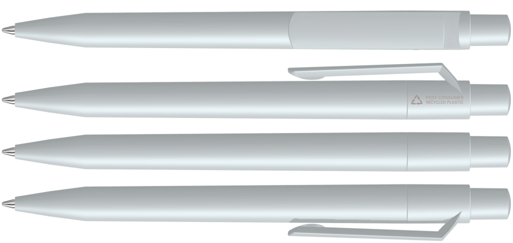 Druckkugelschreiber mit gedeckt mattem Gehäuse, Clip, Drücker und Stopfen aus 100% recyceltem Post-Consumer-Kunststoff.