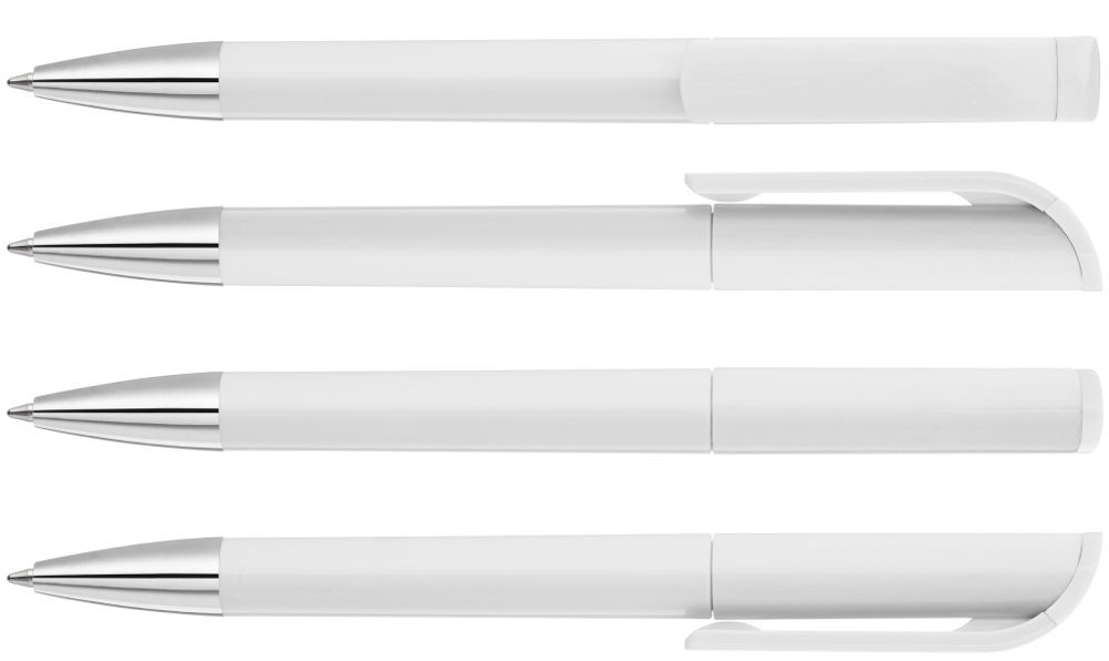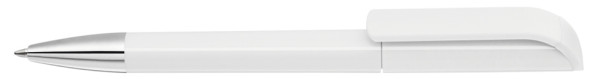 Drehkugelschreiber mit gedeckt glänzendem Gehäuse in weiß, farbig glänzendem Stopfen und Spitze glanzverchromt.