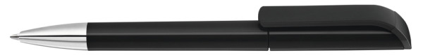 Drehkugelschreiber mit gedeckt glänzendem Gehäuse in weiß, farbig glänzendem Stopfen und Spitze glanzverchromt.