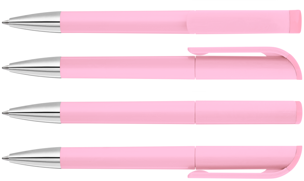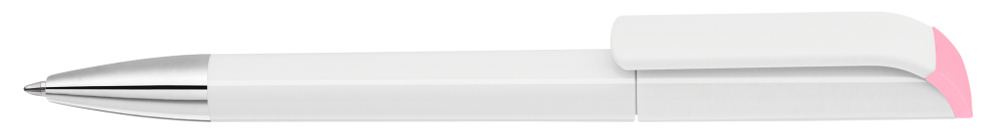 Drehkugelschreiber mit gedeckt glänzendem Gehäuse in weiß, farbig glänzendem Stopfen und Spitze glanzverchromt.