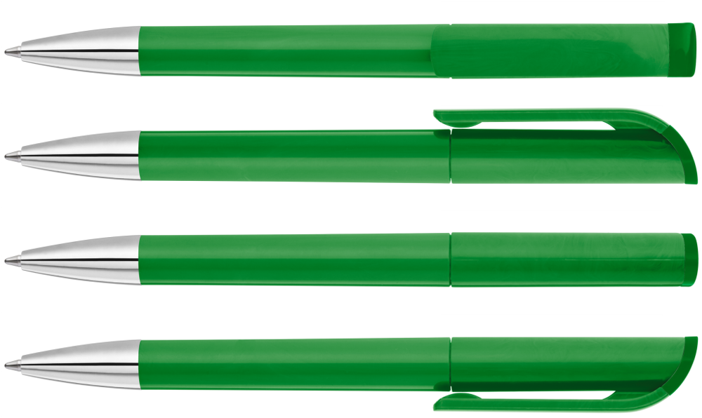 Drehkugelschreiber mit gedeckt glänzendem Gehäuse in weiß, farbig glänzendem Stopfen und Spitze glanzverchromt.