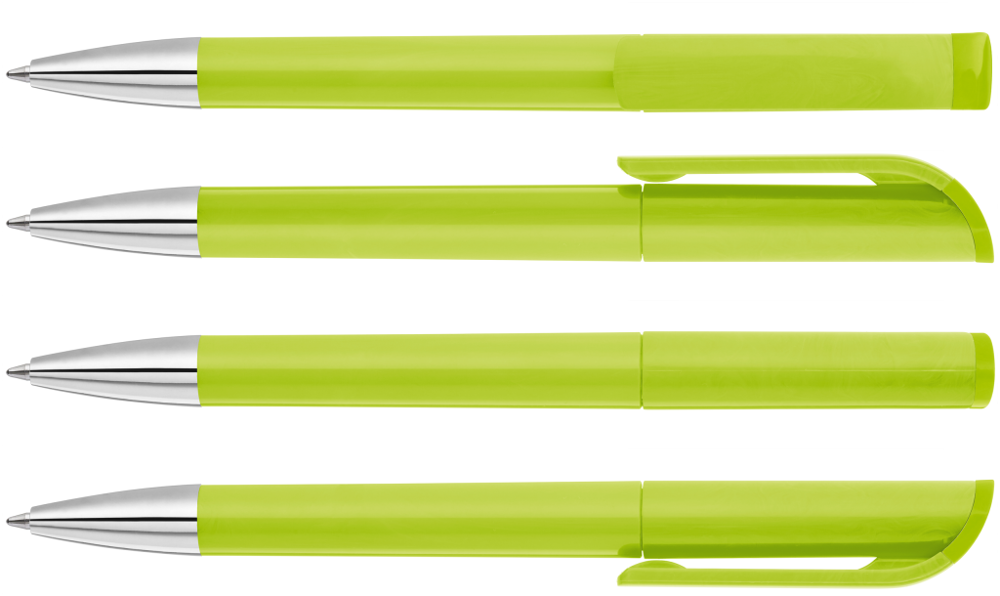 Drehkugelschreiber mit gedeckt glänzendem Gehäuse in weiß, farbig glänzendem Stopfen und Spitze glanzverchromt.