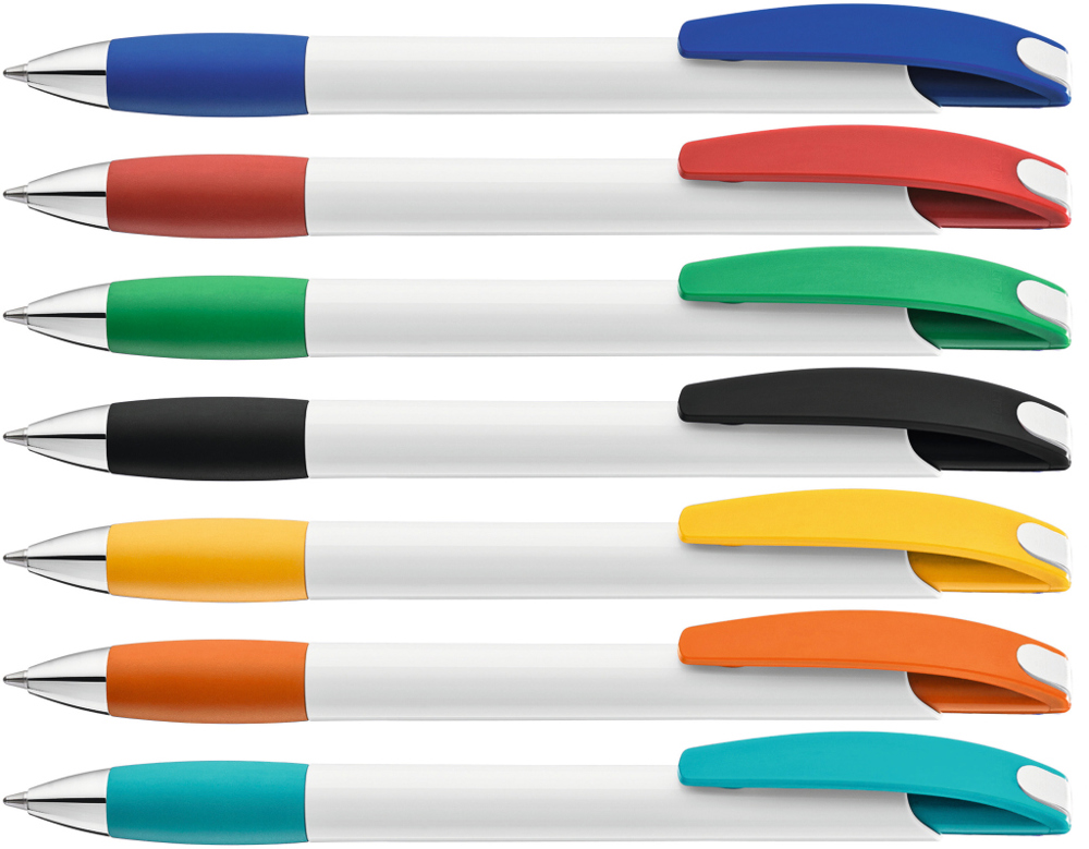 Druckkugelschreiber mit gedeckt glänzendem Gehäuse in weiß, farbiger Gummigriffzone und Clipdrücker. Drückerstopfen und Spitze in silber glänzend.