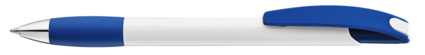 Druckkugelschreiber mit gedeckt glänzendem Gehäuse in weiß, farbiger Gummigriffzone und Clipdrücker. Drückerstopfen und Spitze in silber glänzend.