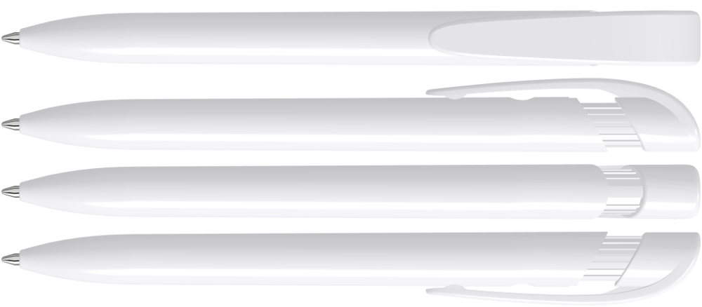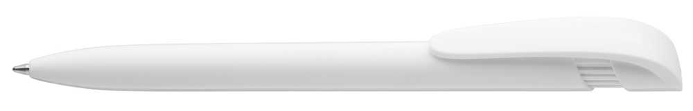 Druckkugelschreiber mit gedeckt glänzendem Gehäuse in schwarz oder weiß und breitem Bogenclipdrücker.