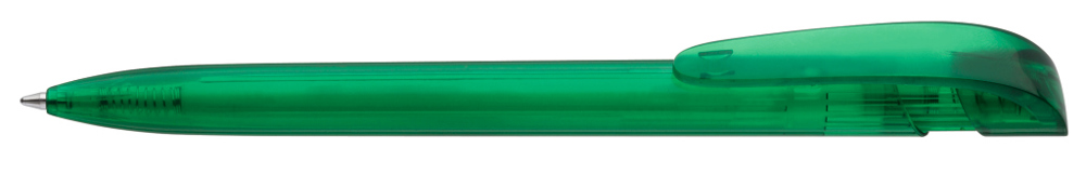 Druckkugelschreiber mit transparent glänzendem Gehäuse und breitem Bogenclipdrücker.
