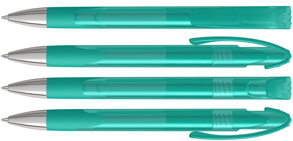Druckkugelschreiber mit transparent glänzendem Gehäuse, Gummigriffzone und schwerer Metallspitze glanzverchromt.