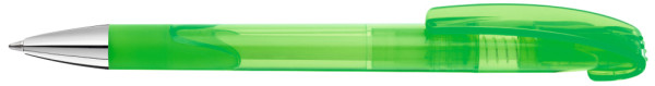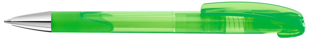 Druckkugelschreiber mit transparent glänzendem Gehäuse, Gummigriffzone und schwerer Metallspitze glanzverchromt.