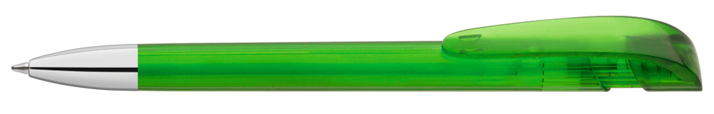 Druckkugelschreiber mit transparent glänzendem Gehäuse, breitem Bogenclipdrücker und schwerer Metallspitze glanzverchromt.