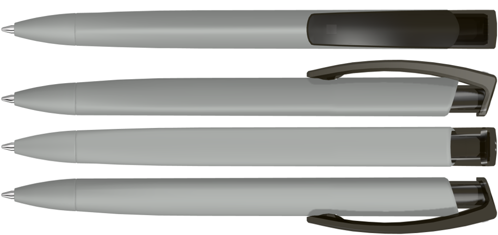 Druckkugelschreiber mit gummiertem Dreikantgehäuse und transparent glänzendem Clip.