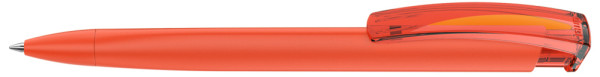 Druckkugelschreiber mit gummiertem Dreikantgehäuse und transparent glänzendem Clip.