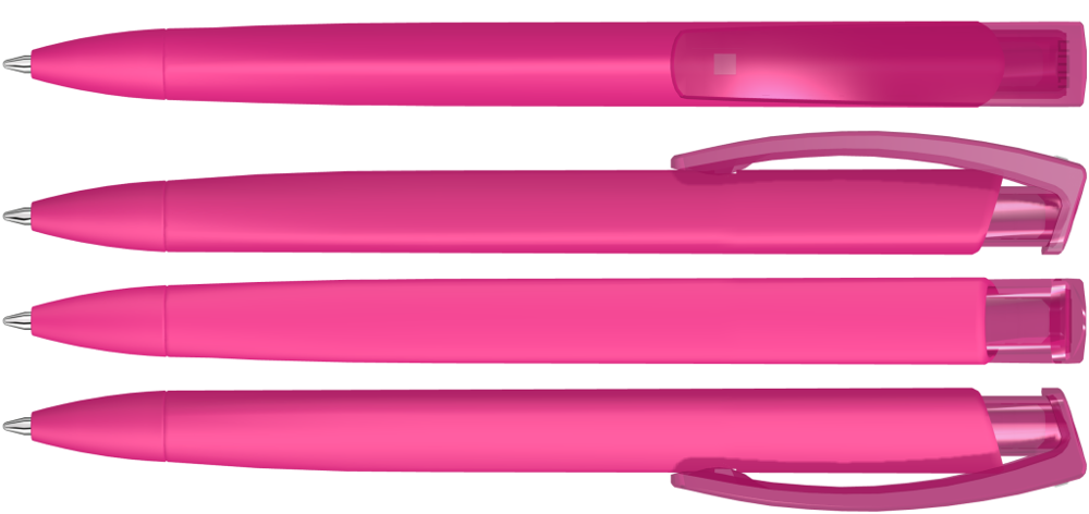 Druckkugelschreiber mit gummiertem Dreikantgehäuse und transparent glänzendem Clip.