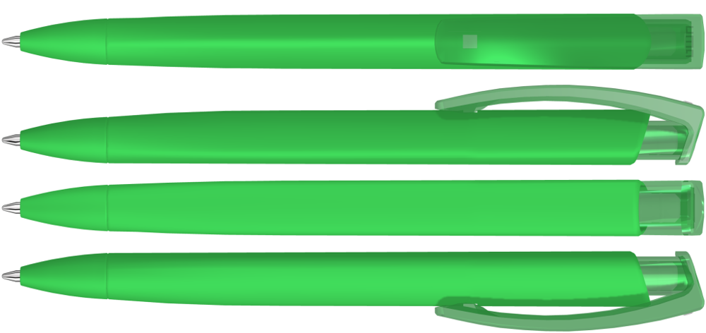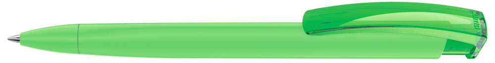 Druckkugelschreiber mit gummiertem Dreikantgehäuse und transparent glänzendem Clip.