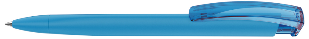 Druckkugelschreiber mit gummiertem Dreikantgehäuse und transparent glänzendem Clip.