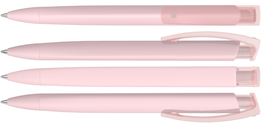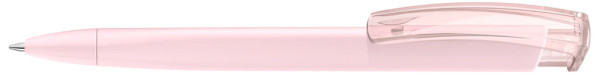 Druckkugelschreiber mit gummiertem Dreikantgehäuse und transparent glänzendem Clip.