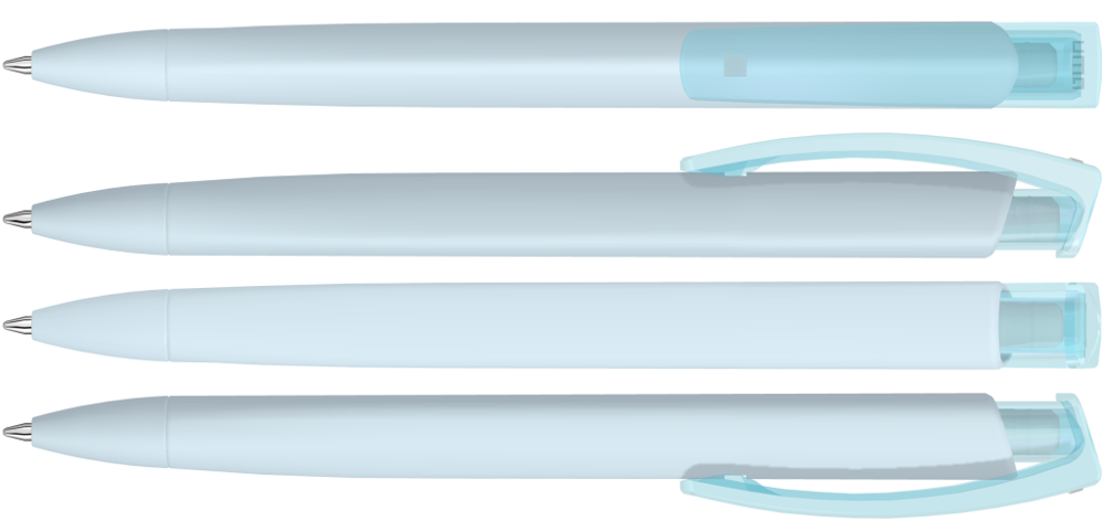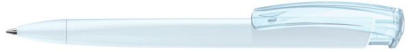 Druckkugelschreiber mit gummiertem Dreikantgehäuse und transparent glänzendem Clip.