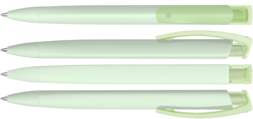 Druckkugelschreiber mit gummiertem Dreikantgehäuse und transparent glänzendem Clip.