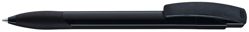 Druckkugelschreiber mit gedeckt glänzendem Schaft und Clipdrücker in weiß. Gummigriffzone und Manschette farbig.
