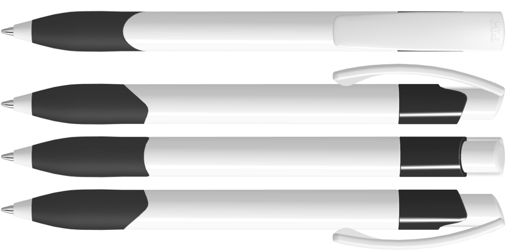 Druckkugelschreiber mit gedeckt glänzendem Schaft und Clipdrücker in weiß. Gummigriffzone und Manschette farbig.