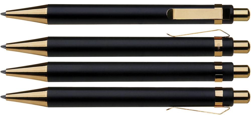 Druckkugelschreiber mit schwarzem oder weißem Gehäuse. Metalldrücker, Metallclip und Metallspitze gold glänzend.
