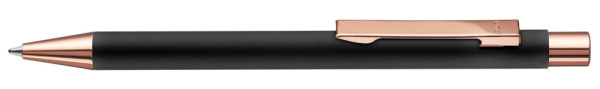 Metall-Druckkugelschreiber mit Softtouch-Gehäuse in schwarz. Metallclip, Metallspitze und Drücker roségold glänzend.