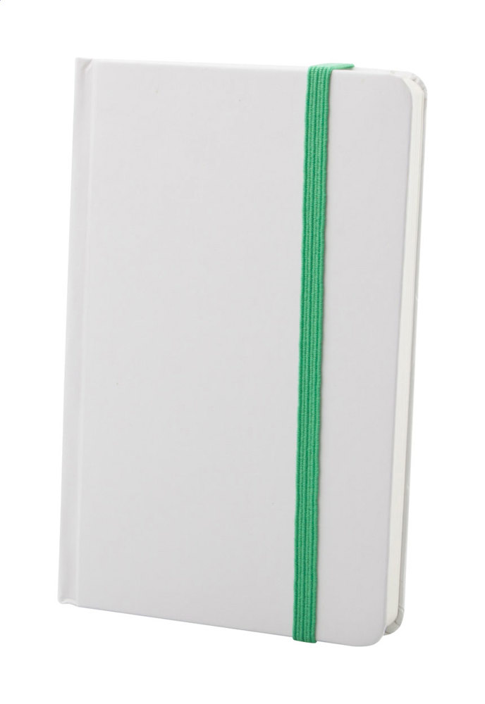Notizbuch mit weißem Karton-Einband, 80 Seiten (blanko) und farbigem Gummiband. A6-Größe.
