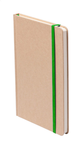 Notizbuch aus recyceltem Karton mit 100 Seiten (blanko), farbigem Lesezeichen und Gummiband.