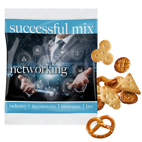Cocktail-Mix aus Laugengebäck und Crackern in verschiedenen Motiven, gemischt in weißem kompostierbarem Werbetütchen verpackt.