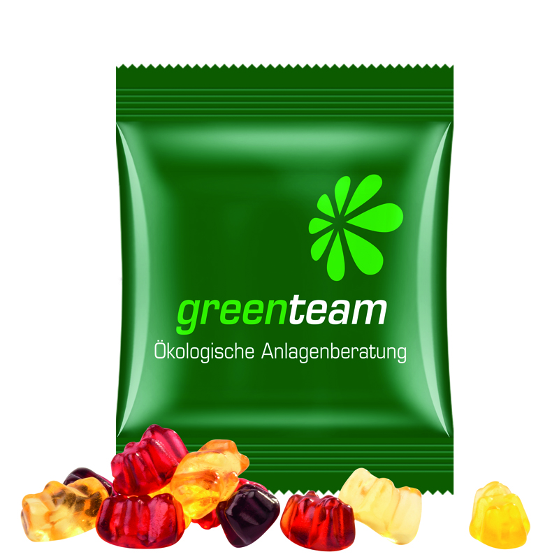 Trolli Gummibärchen in Tüte aus weißer Folie, kompostierbar, individuell bedruckt. Inhalt: Trolli Gummibärchen in Fruchtsaftqualität Exquisit mit 30 % Fruchtsaftanteil, bunt gemischt, 10 g
