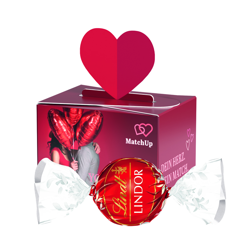 Kleine Werbebox aus weißem Karton, Verschluss mit einem aufgestellten Herz, Box individuell bedruckt. Andere Aufstellformen und Füllvarianten auf Anfrage. Inhalt: 5 Alpenmilch Schokotäfelchen aus, eingewickelt in Pergamin-Papier (kann über die Papiertonne entsorgt werden), 15 g