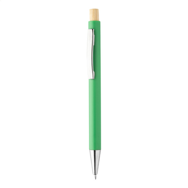 Kugelschreiber aus recyceltem ABS-Kunststoff mit Bambusdrücker und Metallclip, blauschreibend.